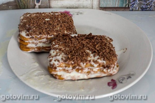 Из самого простого печенья, сметаны и сгущенного молока получается мягкий, вкусный десерт, напоминающий песочное пирожное. Посыпку из шоколада можно заменить толченым арахисом, рубленными грецкими орехами, крошкой из печенья, кокосовой стружкой или смесью какао с сахаром. Если между слоями печенья проложить кусочки бананов или киви, то десерт получится более сочным.