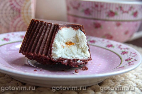 Заполненные формы снова убираем на 15 минут в морозильную камеру. Через 15 минут вновь достаем формочки и покрываем творог оставшимся слоем растопленного шоколада (если шоколад недостаточно жидкий, добавьте во время плавления немного сливочного масла). И опять же убираем в холодильник, чтобы застыл верхний слой шоколада. Примерно через 40 минут, когда шоколад окончательно застынет, сырки легко можно будет извлечь из силиконовых форм. В начинку вместо кураги можно положить ягоды или изюм.