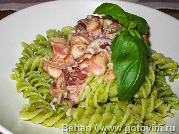 Паста с песто и сливочным соусом с беконом