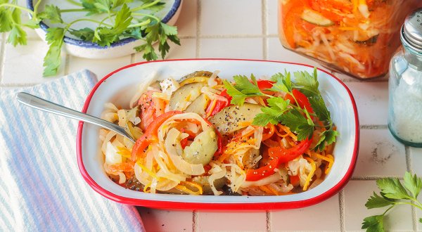 В салат «Берегись, водка!» добавляется небольшое количество сахара, который, уравновешивая соль и кислинку уксуса, делает вкус блюда невероятно гармоничным.
