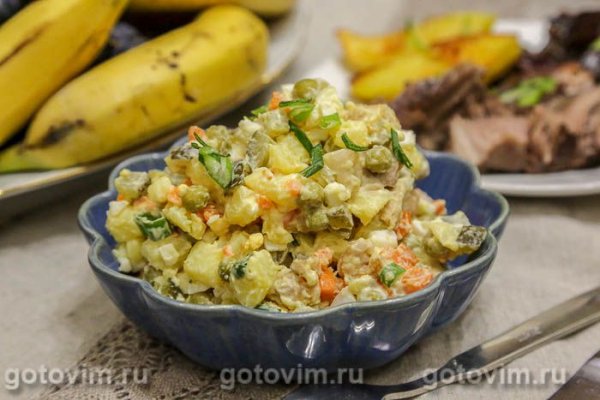 Последними добавить горошек, огурцы и лук. Еще раз проверить, хватает ли в салате соли. Приправить салат оливье с жареной свининой майонезом, перемешать и убрать в холодильник. Дайте салату немного настояться перед подачей. Готовый Оливье переложить в салатник и украсить свежей зеленью. Приятного аппетита!
