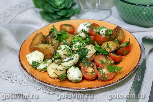 Салат с моцареллой, жареным картофелем‑бэби и помидорами