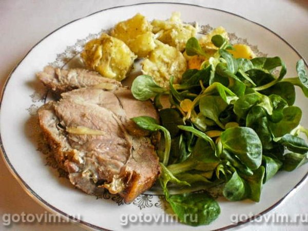 Рецепт запеченной в духовке свиной шейки, нашпигованной чесноком, перцем и лавровым листом. Сверху мясо можно натереть готовой смесью для гриля. На гарнир – картофельный салат с заправкой из оливкового масла с уксусом, медом и горчицей.