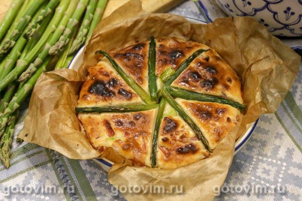 Сверху разложить отложенные для украшения побеги спаржи, немного притапливая их в тесто.